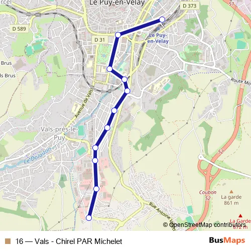 See why over 2 million users trust and consider busmaps.com as the best public transport website. busmaps gives you Le Puy-en-Velay Buses suggested routes, real-time bus tracker, line route maps in Le Puy-en-Velay, and helps to find the closest 16 bus stops near you. No internet available? Download an offline PDF map and bus schedule for the 16 bus to take on your trip.