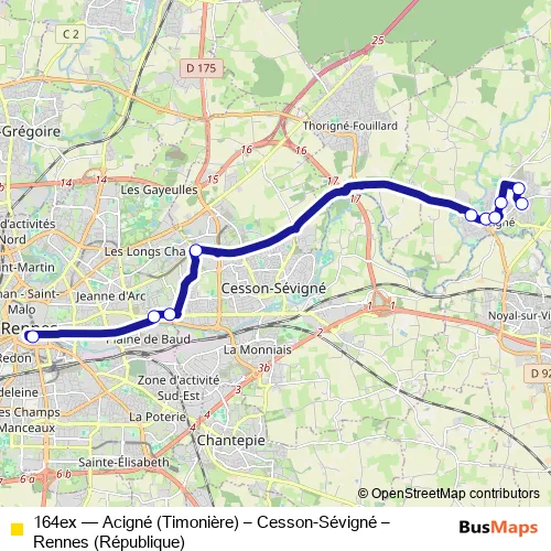 Bus 164ex - Acigné (Timonière) – Cesson-Sévigné – Rennes (République) in Acigne: Stops & Timetable