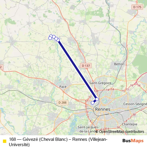 Click here to view the nearest 168 - Gévezé (Cheval Blanc) – Rennes (Villejean-Université) bus stop.