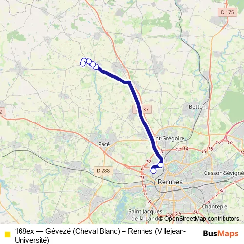 Click here to view the nearest 168ex - Gévezé (Cheval Blanc) – Rennes (Villejean-Université) bus stop.