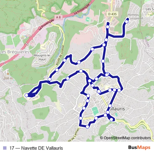 See why over 2 million users trust and consider busmaps.com as the best public transport website. busmaps gives you Vallauris Buses suggested routes, real-time bus tracker, line route maps in Vallauris, and helps to find the closest 17 bus stops near you. No internet available? Download an offline PDF map and bus schedule for the 17 bus to take on your trip.