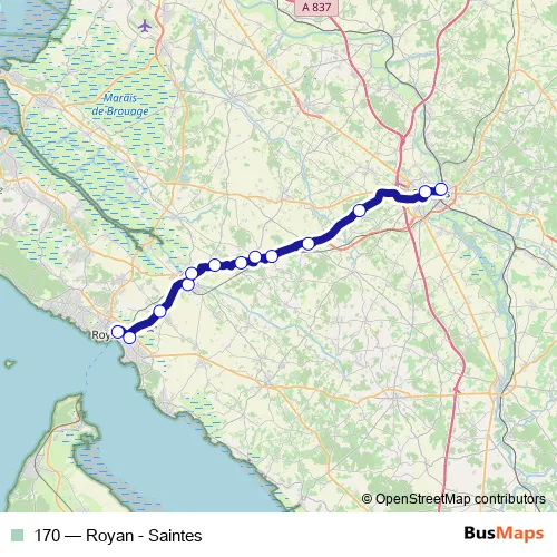 The first stop of the 170 bus route is ROY Gare Intermodale and the last stop is STE Gare Sncf Saintes. 170 (Royan - Saintes) is operational during entre semana.