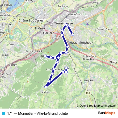 Route des Deux Salèves - Route des Trois Lacs - Route du Salève - Route d'Esserts - Route des Bornes - Route d'Annemasse - Route des Crêtets - Rue des Greffions - Route d'Annemasse - Rue de l'Église - Rue de Bersat - Rue de Bellecombe