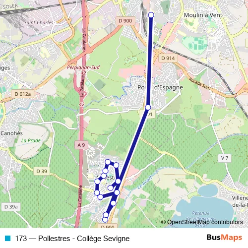 The first stop of the 173 bus route is Collège Sevigne and the last stop is Europe. 173 (Pollestres - Collège Sevigne) is operational during entre semana.