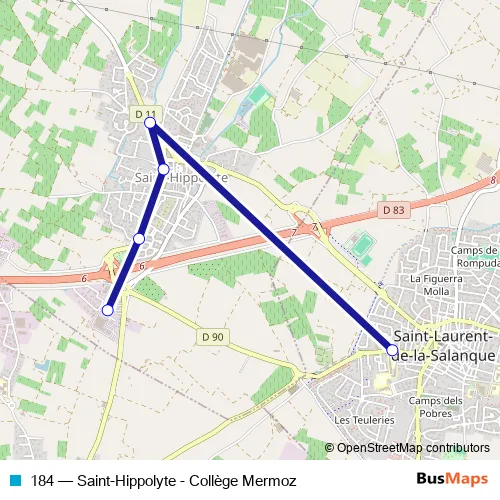 The first stop of the 184 bus route is St-Hippolyte - Zone Artisanale and the last stop is Collège Jean Mermoz. 184 (Saint-Hippolyte - Collège Mermoz) is operational during entre semana.
