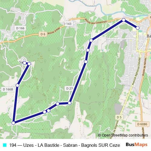 Click here to view the nearest 194 - Uzes - LA Bastide - Sabran - Bagnols SUR Ceze bus stop.