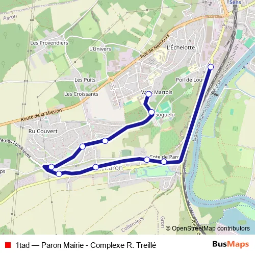 The first stop of the 1tad bus route is Paron Mairie and the last stop is Paron Collège. 1tad (Paron Mairie - Complexe R. Treillé) is operational during todos los días.