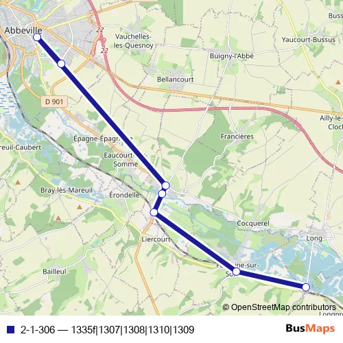 The first stop of the 2-1-306 bus route is Abbeville - Collège Ponthieu and the last stop is Long - Le Catelet. 2-1-306 (1335f|1307|1308|1310|1309) is operational during todos los días.