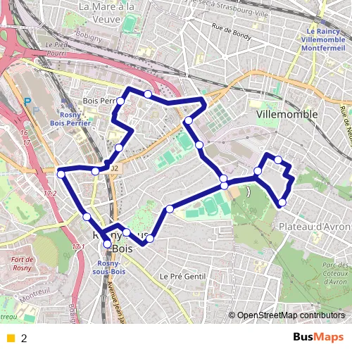 The first stop of the 2 bus route is Rosny-sous-Bois Rer and the last stop is Rosny-sous-Bois Rer. 2 is operational during todos los días.