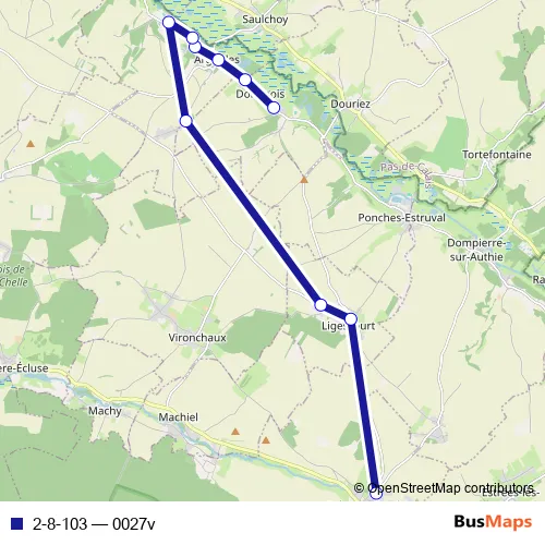 The first stop of the 2-8-103 bus route is Dominois - Mairie and the last stop is Crecy-EN-Ponthieu - Collège Jules Roy. 2-8-103 (0027v) is operational during todos los días.