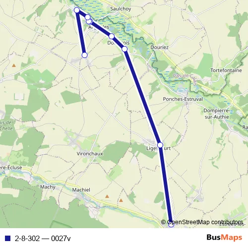The first stop of the 2-8-302 bus route is Crecy-EN-Ponthieu - Collège Jules Roy and the last stop is Argoules - Petit Chemin - Salle communale. 2-8-302 (0027v) is operational during todos los días.