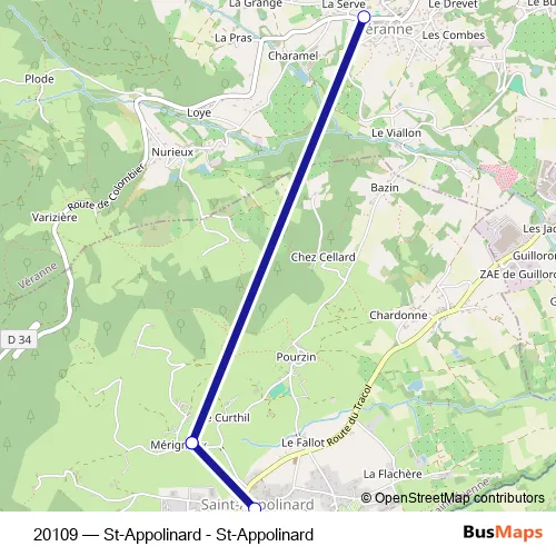 The first stop of the 20109 bus route is Ecole and the last stop is Mérigneux. 20109 (St-Appolinard - St-Appolinard) is operational during todos los días.