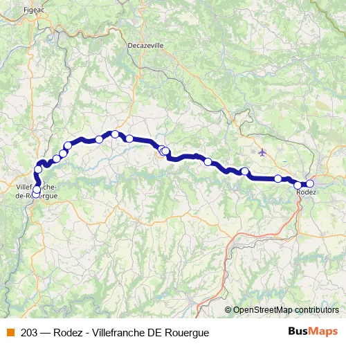 The first stop of the 203 bus route is Villefranche-DE-Rouergue - Gare Sncf and the last stop is Rodez - Gare Sncf/Routière. 203 (Rodez - Villefranche DE Rouergue) is operational during todos los días.