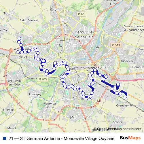The first stop of the 21 bus route is Ardenne and the last stop is Village Oxylane. 21 (ST Germain Ardenne - Mondeville Village Oxylane) is operational during todos los días.