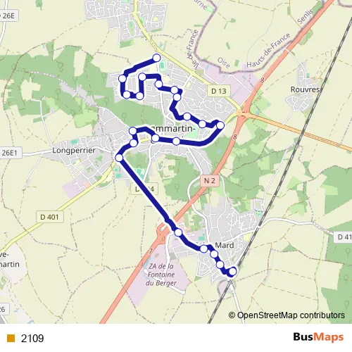 The first stop of the 2109 bus route is Centre Médical and the last stop is Gare de Dammartin - Juilly - Saint-Mard. 2109 is operational during todos los días.