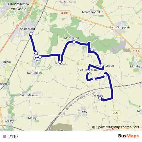 The first stop of the 2110 bus route is Gare de Dammartin - Juilly - Saint-Mard and the last stop is Centre. 2110 is operational during entre semana.