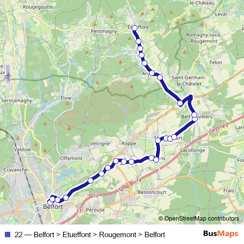The first stop of the 22 bus route is République and the last stop is Forge Musée. 22 (Belfort > Etueffont > Rougemont > Belfort) is operational during todos los días.