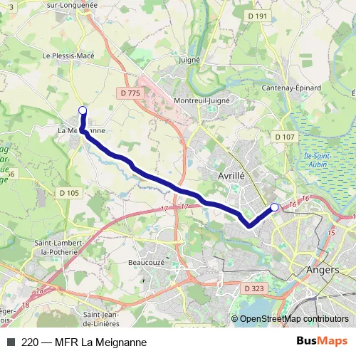 The first stop of the 220 bus route is Mauny and the last stop is Terra Botanica. 220 (MFR La Meignanne) is operational during entre semana.