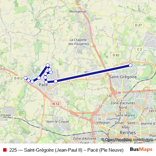 The first stop of the 225 bus route is Jean-Paul Ii and the last stop is Pie Neuve. 225 (Saint-Grégoire (Jean-Paul II) – Pacé (Pie Neuve)) is operational during todos los días.