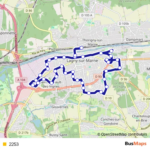 The first stop of the 2253 bus route is Gare de Lagny Thorigny and the last stop is Gare de Lagny Thorigny. 2253 is operational during todos los días.