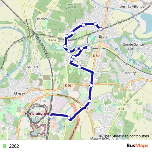 The first stop of the 2262 bus route is Chessy Nord - Quai F and the last stop is Gare d'Esbly (Quai B). 2262 is operational during todos los días.