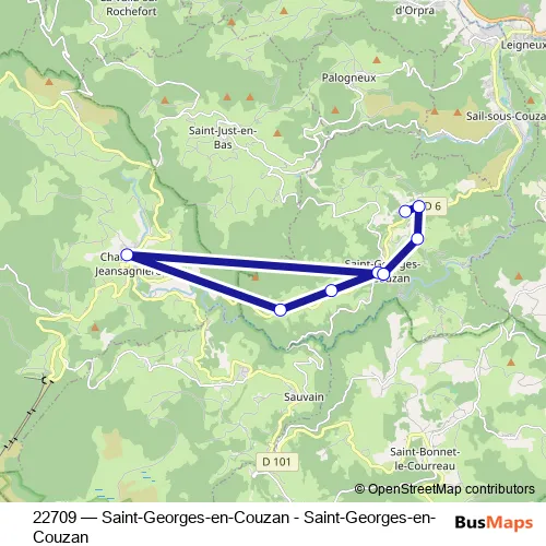 The first stop of the 22709 bus route is Ecole and the last stop is Petites Combes. 22709 (Saint-Georges-en-Couzan - Saint-Georges-en-Couzan) is operational during todos los días.