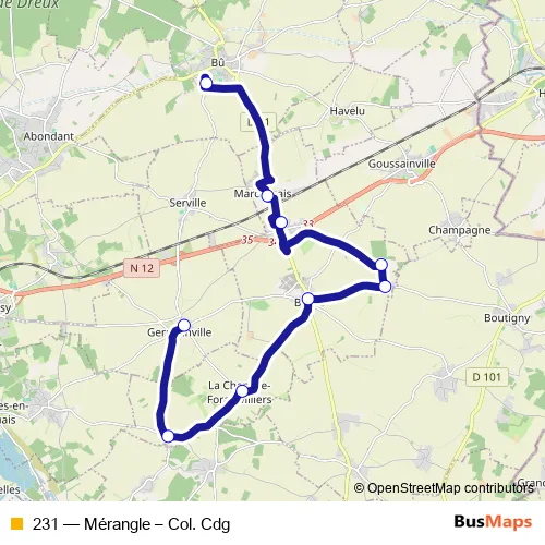 The first stop of the 231 bus route is Collège de Bû and the last stop is Ecole M. Taugourdeau (Germainville). 231 (Mérangle – Col. Cdg) is operational during entre semana.