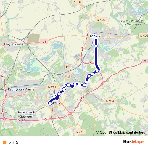 The first stop of the 2319 bus route is Gare de Val d'Europe and the last stop is Gare de Meaux (Dépose). 2319 is operational during todos los días.