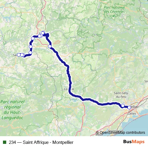 The first stop of the 234 bus route is Montpellier - Gare St Roch and the last stop is Saint-Affrique - Gare Routière. 234 (Saint Affrique - Montpellier) is operational during todos los días.