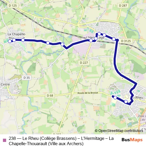 The first stop of the 238 bus route is Collège Brassens and the last stop is Ville aux Archers. 238 (Le Rheu (Collège Brassens) – L'Hermitage – La Chapelle-Thouarault (Ville aux Archers)) is operational during entre semana.