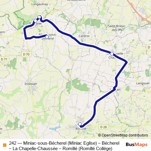Click here to view the nearest 242 - Miniac-sous-Bécherel (Miniac Eglise) – Bécherel – La Chapelle-Chaussée – Romillé (Romillé Collège) bus stop.