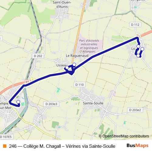 The first stop of the 246 bus route is Collège Marc Chagall and the last stop is Loiré Le Moulin. 246 (Collège M. Chagall – Vérines via Sainte-Soulle) is operational during entre semana.