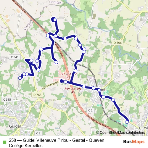 The first stop of the 258 bus route is Collège Kerbellec and the last stop is Villeneuve Piriou. 258 (Guidel Villeneuve Piriou - Gestel - Queven Collège Kerbellec) is operational during entre semana.
