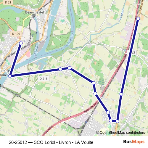 The first stop of the 26-25012 bus route is 3 Vallées and the last stop is Les Caires. 26-25012 (SCO Loriol - Livron - LA Voulte) is operational during entre semana.