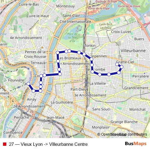 See why over 2 million users trust and consider busmaps.com as the best public transport website. busmaps gives you Lyon Buses suggested routes, real-time bus tracker, line route maps in Lyon, and helps to find the closest 27 bus stops near you. No internet available? Download an offline PDF map and bus schedule for the 27 bus to take on your trip.