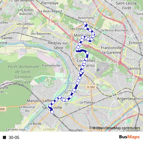 The first stop of the 30-05 bus route is Gare de Sartrouville and the last stop is Gare de Montigny - Beauchamp. 30-05 is operational during todos los días.