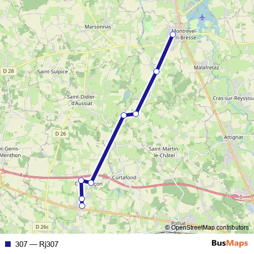 The first stop of the 307 bus route is Montrevel-en-Bresse-Montrevel-EN-Bresse - College DE L'Huppe-MOB-College De and the last stop is Confrancon-Confrancon - Stade-CON-Stade. 307 (Rj307) is operational during entre semana.