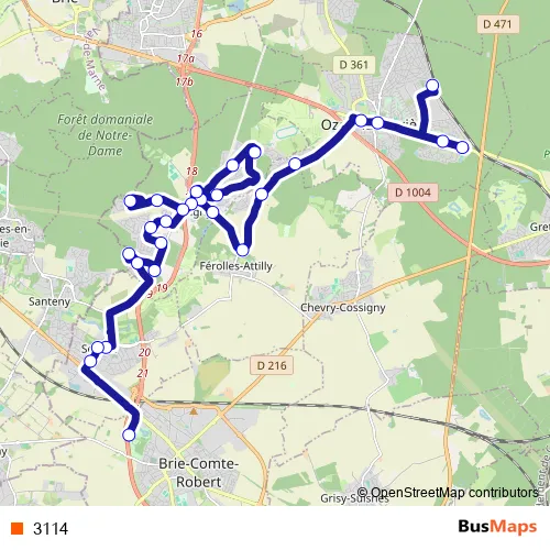The first stop of the 3114 bus route is Gare d'Ozoir-la-Ferrière and the last stop is Lycée Blaise Pascal Parking. 3114 is operational during todos los días.