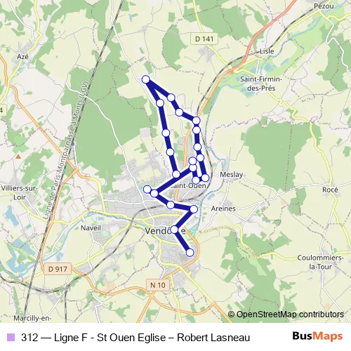 The first stop of the 312 bus route is Vendome R Lasneau and the last stop is ST Ouen 18 Route DE Danze. 312 (Ligne F - St Ouen Eglise – Robert Lasneau) is operational during entre semana.