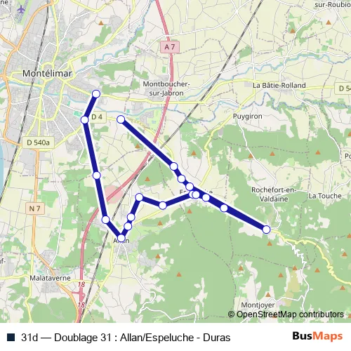 The first stop of the 31d bus route is Chabrillan Cite Scolaire and the last stop is Menuiserie. 31d (Doublage 31 : Allan/Espeluche - Duras) is operational during entre semana.