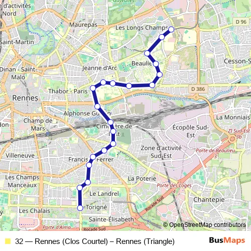 See why over 2 million users trust and consider busmaps.com as the best public transport website. busmaps gives you Rennes Buses suggested routes, real-time bus tracker, line route maps in Rennes, and helps to find the closest 32 bus stops near you. No internet available? Download an offline PDF map and bus schedule for the 32 bus to take on your trip.
