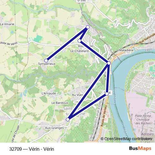 The first stop of the 32709 bus route is Sympérieux and the last stop is Ecole. 32709 (Vérin - Vérin) is operational during todos los días.