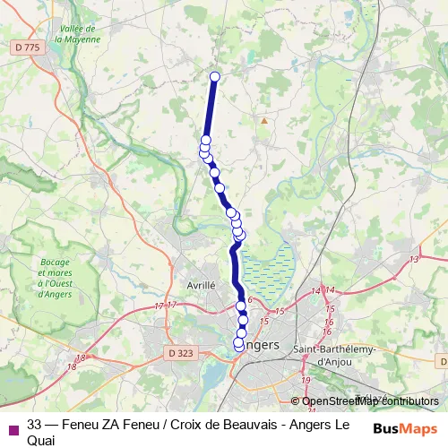 The first stop of the 33 bus route is Le Quai and the last stop is Croix de Beauvais. 33 (Feneu ZA Feneu / Croix de Beauvais - Angers Le Quai) is operational during todos los días.