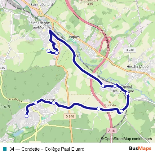 The first stop of the 34 bus route is Collège Paul Eluard and the last stop is Béthune. 34 (Condette – Collège Paul Eluard) is operational during entre semana.