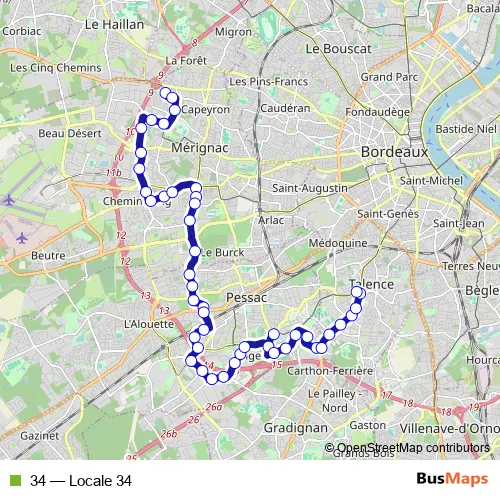 The first stop of the 34 bus route is Les Pins and the last stop is Peixotto (Tram B). 34 (Locale 34) is operational during todos los días.