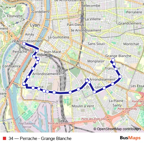 The first stop of the 34 bus route is Grange Blanche and the last stop is Perrache. 34 (Perrache - Grange Blanche) is operational during todos los días.