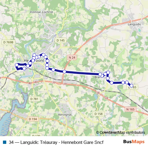 The first stop of the 34 bus route is Tréauray and the last stop is Gare Sncf. 34 (Languidic Tréauray - Hennebont Gare Sncf) is operational during todos los días.