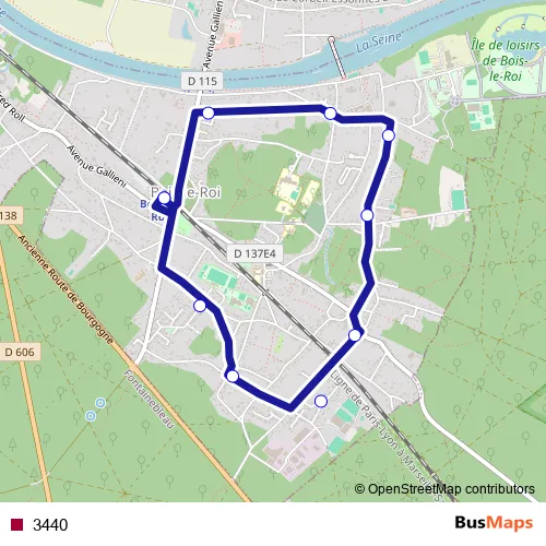 The first stop of the 3440 bus route is Gare de Bois le Roi and the last stop is Gare de Bois le Roi. 3440 is operational during entre semana.