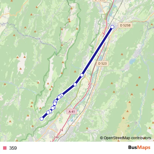 The first stop of the 359 bus route is Pontcharra, Lycée Pierre Terrail Parvis and the last stop is Plateau-des-Petites-Roches, Saint-Pancrasse Mairie. 359 is operational during entre semana.