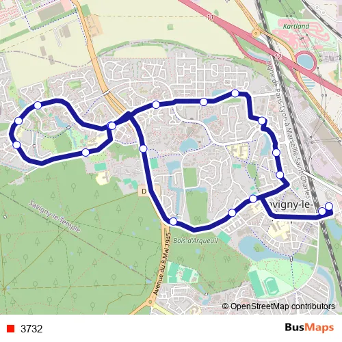 The first stop of the 3732 bus route is Gare de Savigny - Nandy and the last stop is Gare de Savigny - Nandy. 3732 is operational during todos los días.